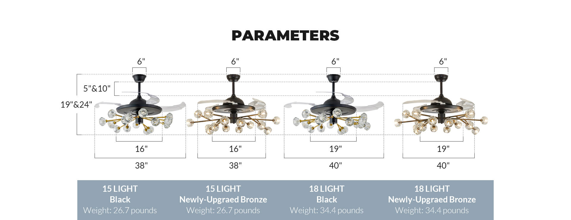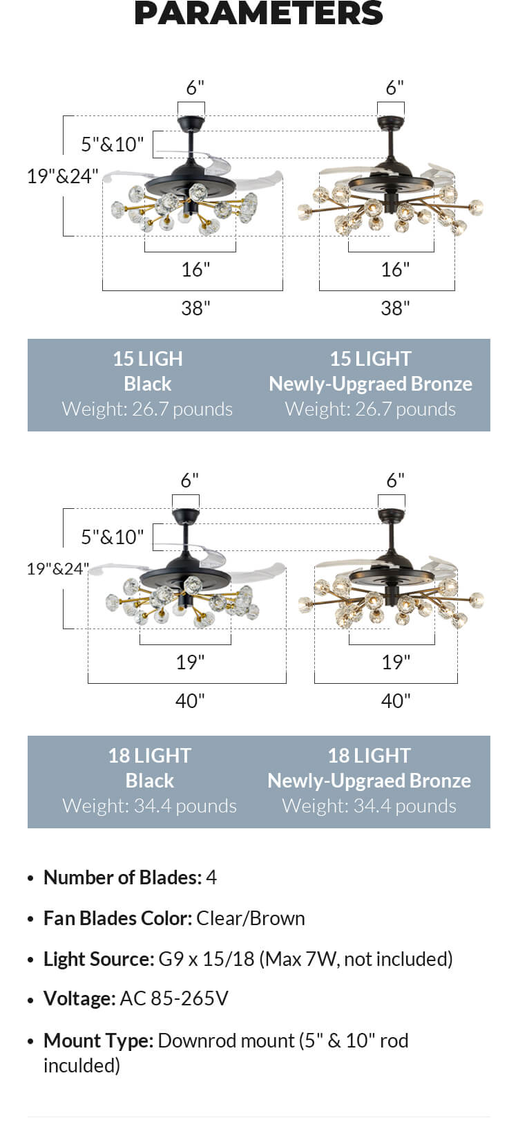 | Lampshade Width | 27" / 33" (Blades fully closed) |